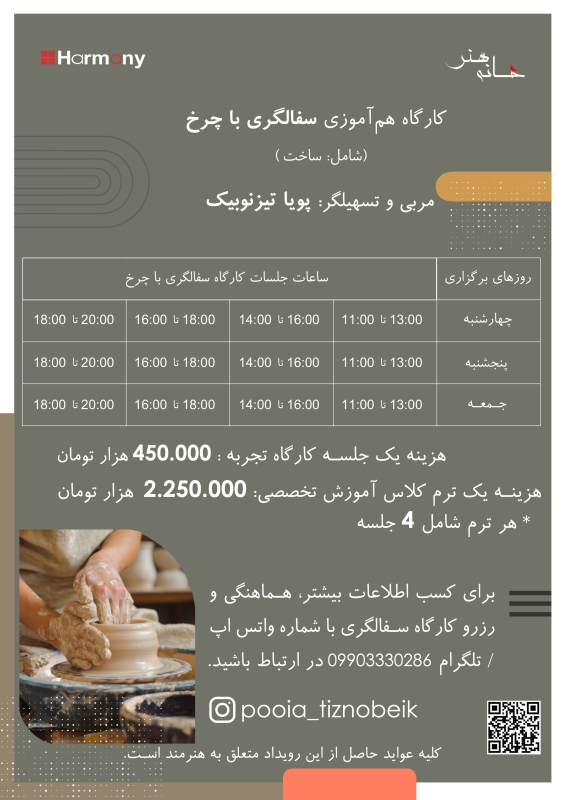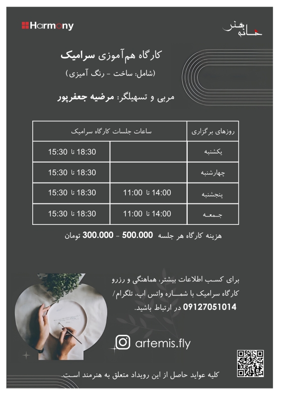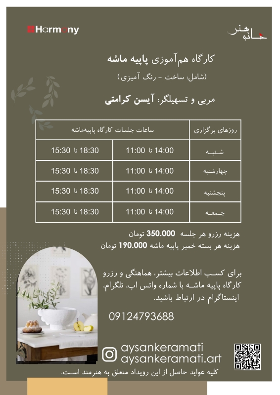 کارگاههای هم آموزی سرامیک، نقاشی و چاپ دستی و پاپیهماشه، در روزهای چهارشنبه، پنج شنبه و جمعه هر هفته در طبقه دوم هارمونیک سنتر برگزار میشود. جهت تعیین وقت قبلی برای شرکت در این کارگاهها میتوانید با شماره 32828300-026 داخلی 163 تماس بگیرید.